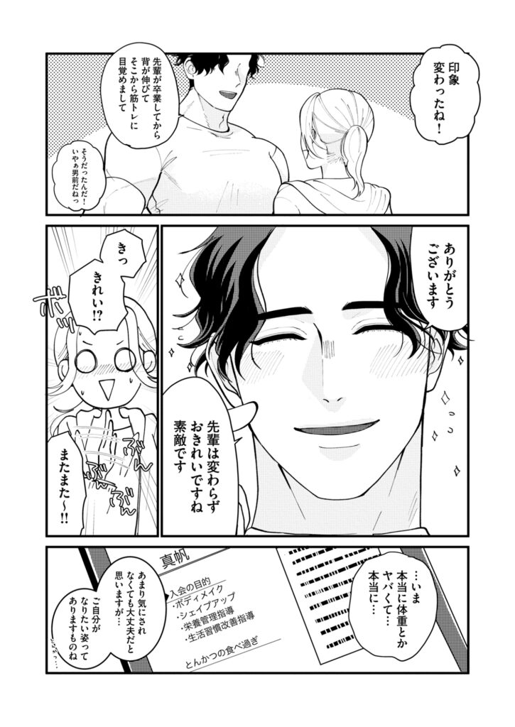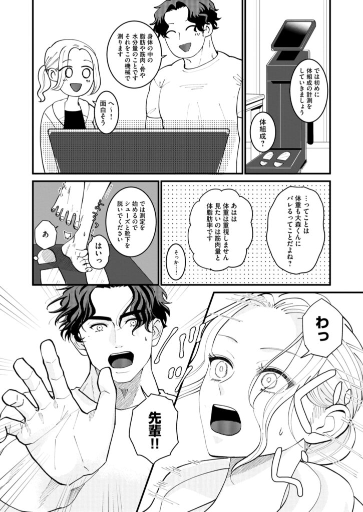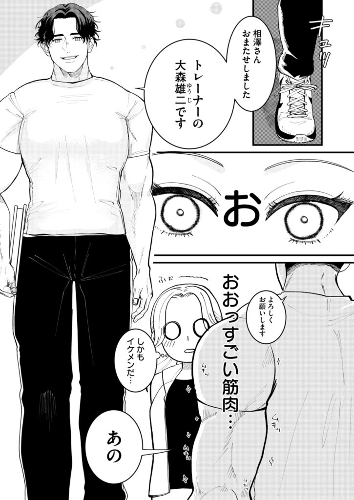 担当は筋骨隆々、さわやかイケメン!?なんと彼は学生時代は小柄だった後輩の大森君だった!運動不足で基礎もダメダメ…、でも何だか大森君…距離感…近くない?真面目なはずのトレーニングも、何だか体温と目の前の雄みにあてられて…真帆の妄想も限界に…。