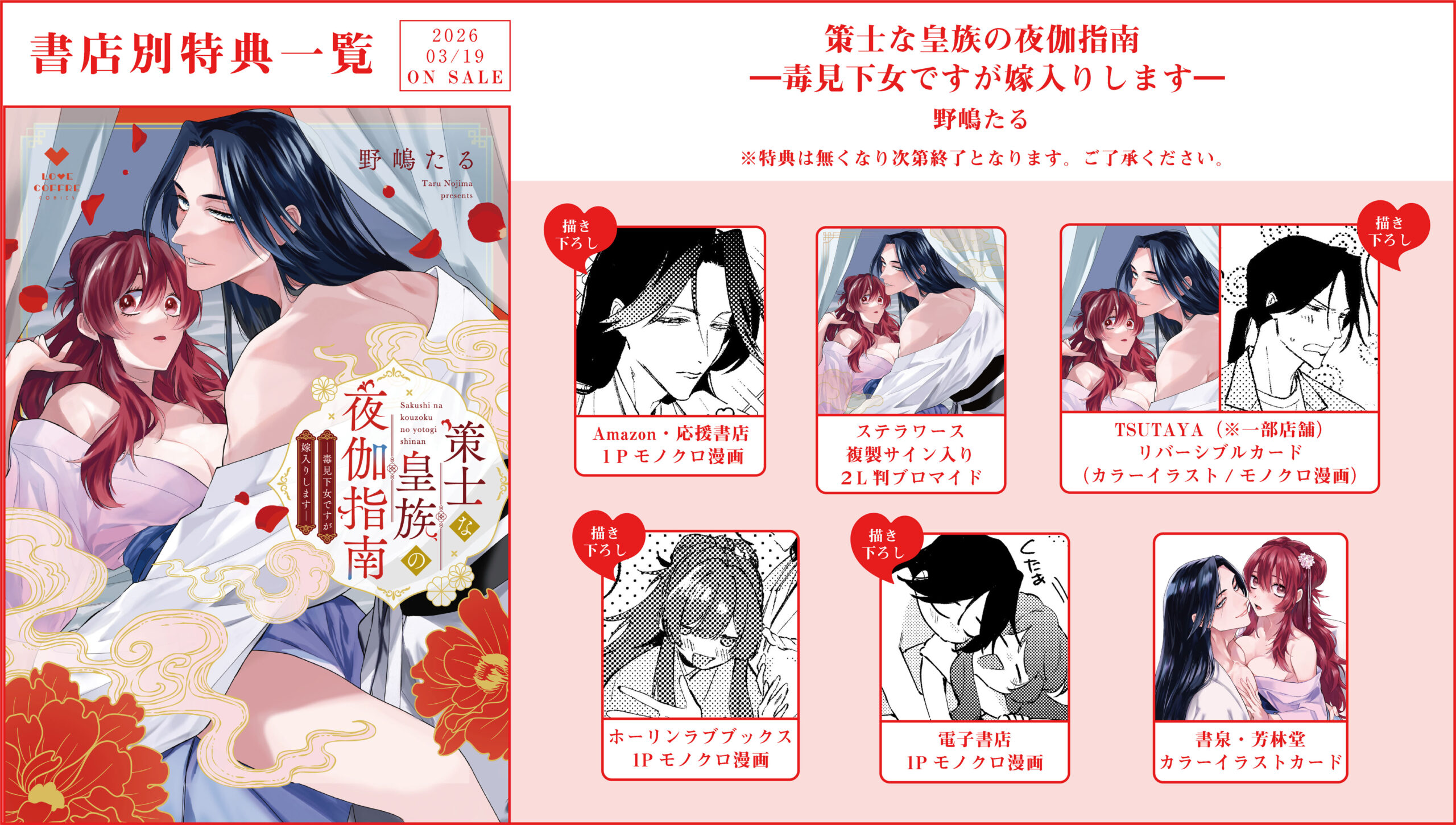 ラブコフレコミックスから、『策士な皇族の夜伽指南 ―毒見下女ですが嫁入りします―』(野嶋たる)が3月19日に発売されます!